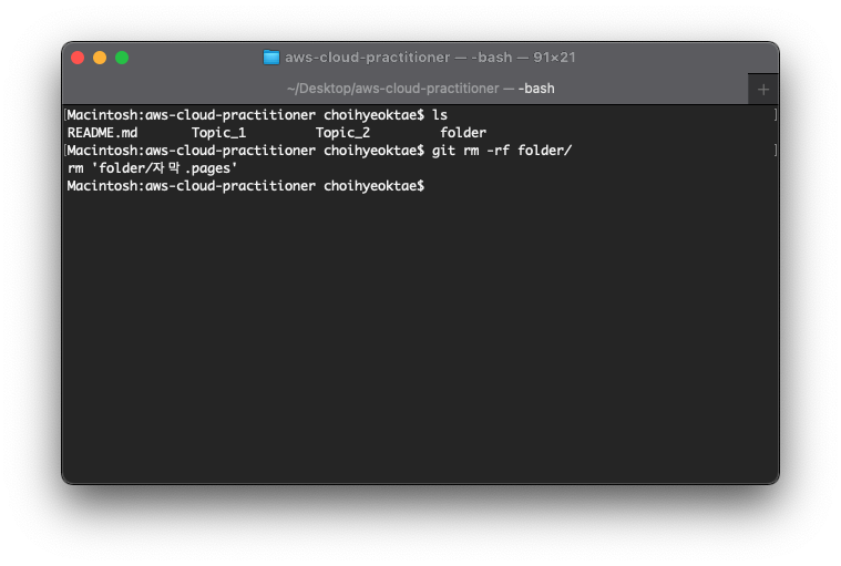 1. 터미널을 켜고 삭제하고싶은 폴더가 있는 디렉토리로 이동한다.