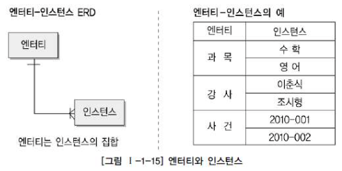 - 엔터티는 인스턴스의 집합이라고 할 수 있고, 반대로 인스턴스라는 것은 엔터티의 하나의 값에 해당한다고 할 수 있다.