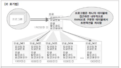아래 그림은 요금 테이블에 PK가 요금일자+요금번호로 구성되어있고 데이터 컨수가 1억 2천만건인 대용량 테이블이다. 이때 요금의 특성상 월 단위로 결제하는 경우가 많으므로 PK인 요금 일자의 년+월을 이용하여 12개의 파티션 테이블을 만들었다.