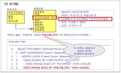 수강신청 테이블에 있는 학사기준번호가 SQL WHERE 절에 비교자로 들어오진 않았지만, 수강신청 테이블에서 상속받은 학사기준번호에 대해 인덱스를 생성하지 않으므로 학사기준과 수강신청 테이블이 조인되면서 수강신청 테이블이 FULL TABLE SCAN으로 성능이 저하되었다.