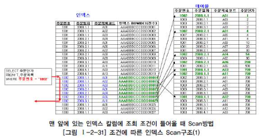 위 그림에서는 주문번호에 대한 비교값이 들어오지 않으므로 인덱스 전체를 읽어야만 원하는 데이터를 찾을 수 있다.