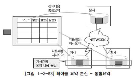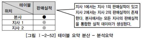 위 그림에서 보면, 테이블에 있는 모든 칼럼과 로우가 지사에도 동일하게 존재하지만 각 지사에는 타 지사와 다른 요약정보를 가지고 있고, 본사에는 각 지사의 요약정보에 대한 데이터를 같은 위치에 두는 것으로 통합하여 전체에 대한 요약 정보를 가지고있는 것으로 표시된다.