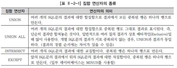 집합 연산자를 사용하여 만들어지는 SQL 문의 형태는 다음과 같다.