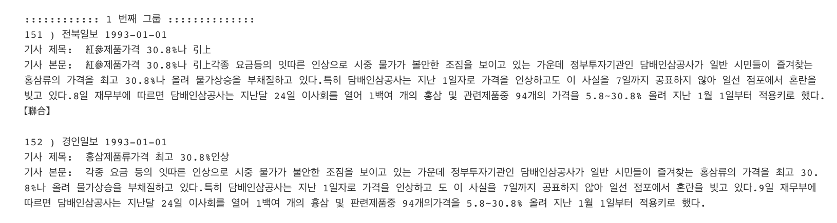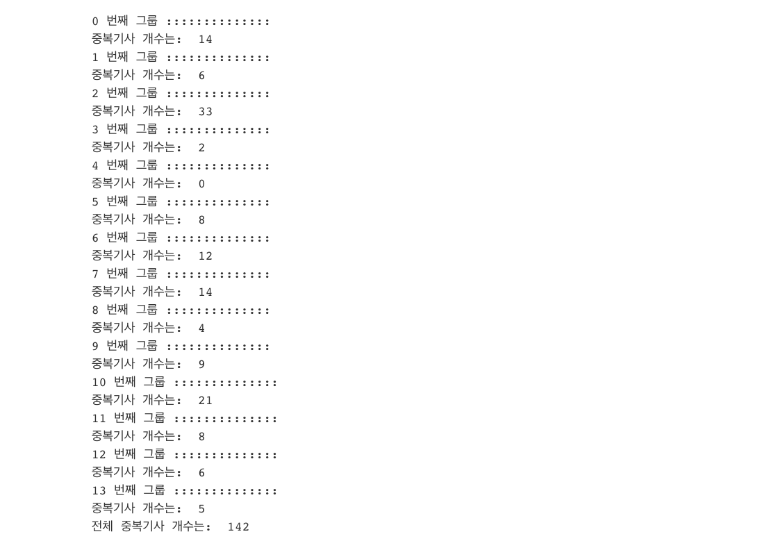 기사가 들어있는 리스트(dflist 로 정의해놓았다.)에서 저장된 인덱스만으로 기사를 가져오니, 실제 기사 본문과 기사의 인덱스가 일치하지 않는 문제가 발생했다. 나중에 코드를 처음부터 꼼꼼히 살펴보니 dflist 는 처음에 기사 모두를 불러온 리스트였고, 중복기사를 가져올 때는 Kmeans 단계에서 분류한 그룹에서 가져와야 했다. 그 결과 성공적으로 중복기사를 검출한 모습을 볼 수 있다.
