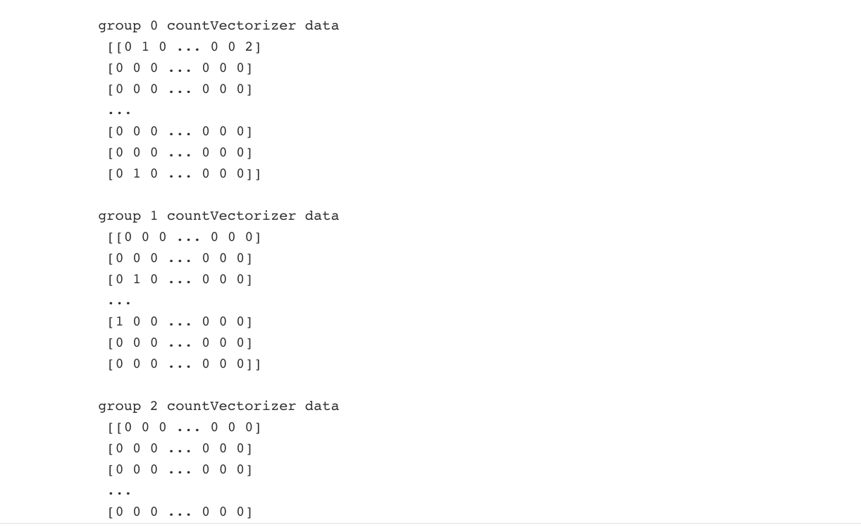 scikit learn 내의 라이브러리인 countVectorizer를 사용하여 기사 본문에 나오는 단어 빈도를 계산하여 2차원 행렬로 만든다.