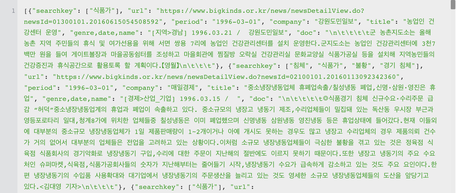 위의 사진은 크롤링한 기사들에 여러 필드를 추가하는 전처리가 완료된 json 파일의 내부이다.