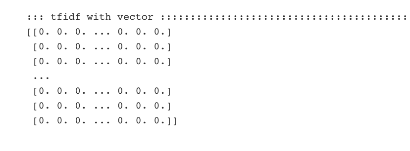 scikit learn 내의 라이브러리인 tf-idf를 사용하여 기사 각각의 tf-idf 값을 계산한다. 실행 후 결과는 이렇게 이차원배열이 만들어진다.