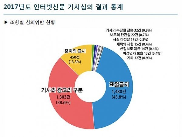 위 통계는 '2017년도 인터넷신문 기사심의 결과 통계' 이다. 가장 많은 부분을 차지하는 것은 표절 기사였다.