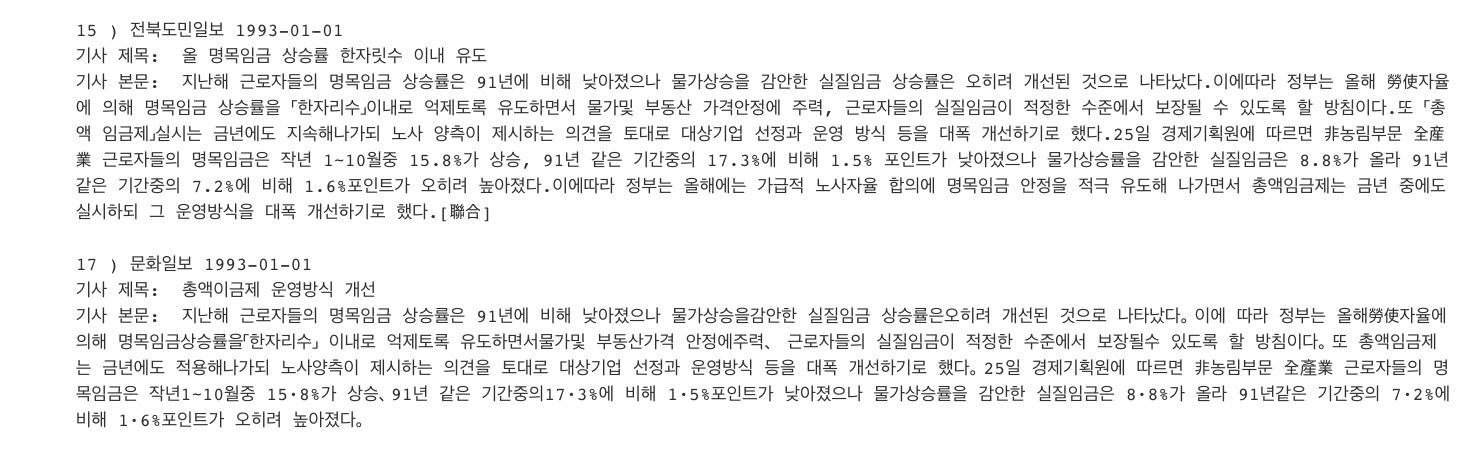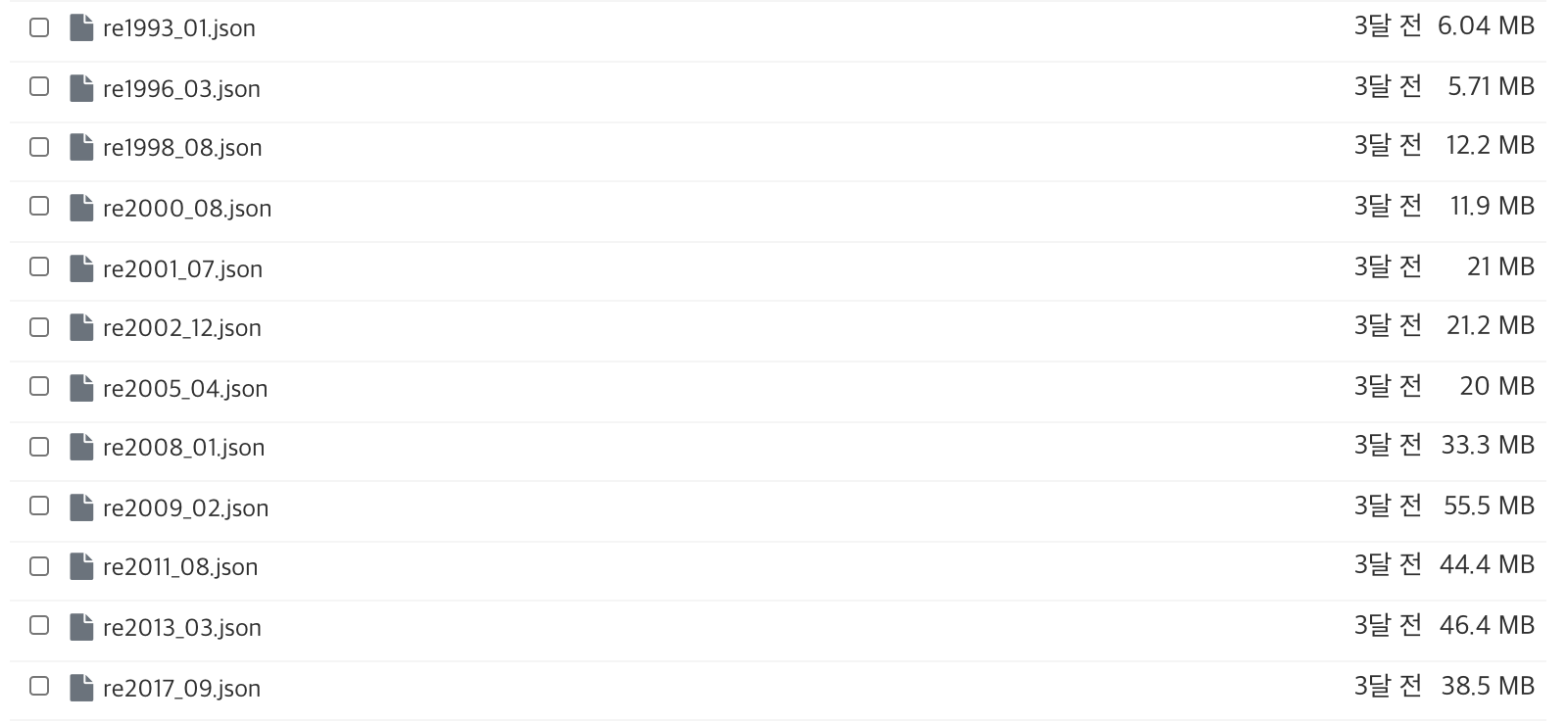 이 프로젝트에서는 공공 뉴스 아카이브인 빅카인즈에서 1993년 ~ 2017년까지의 기사를 약 10만개정도 크롤링 후, 여러 필드를 추가한 json 파일을 사용했다. 파일 이름에 대해 짧게 설명하자면 re1993_01.json 파일은 1993년 01월 01일~31일까지 특정 키워드에 대하여 크롤링한 기사들의 모음이다.