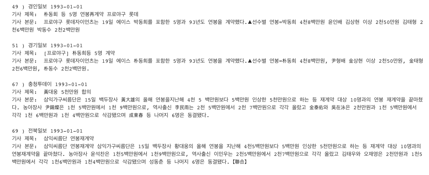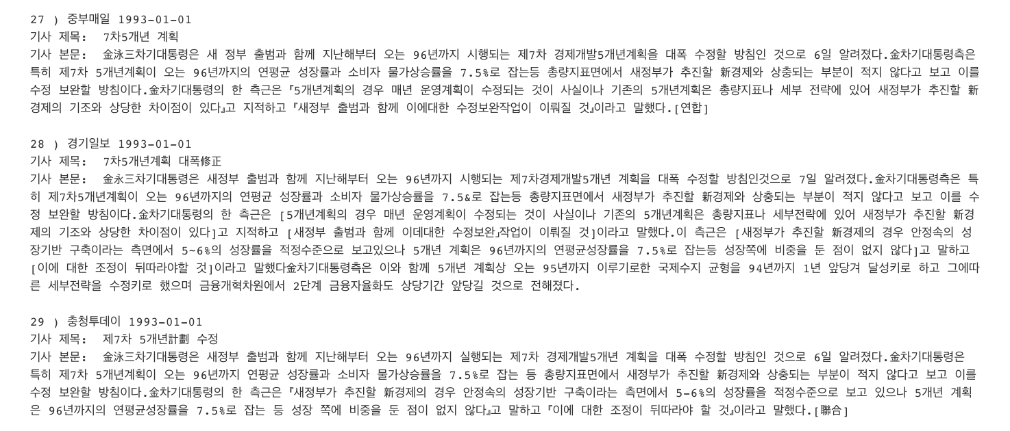 맨 앞에 있는 숫자(사진에서는 27, 28, 29)는 무작위로 크롤링된 기사들에 순서대로 배정된 index number이다. 중부매일, 경기일보, 충청투데이 등은 기사를 작성한 언론사이고, 그 뒤에 있는 날짜는 기사를 작성한 날짜이다. 기사 제목과 본문을 같이 출력한다.