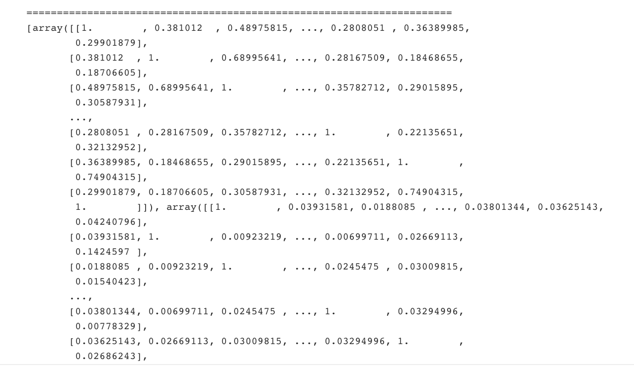 앞 단계에서 생성된 행렬을 가지고 같은 그룹 내 기사간의 코사인 유사도를 계산한다. 코사인 유사도 결과가 0.9 이상이면 중복기사라고 판단한다. 코사인 유사도를 검사한 결과가 이렇게 삼차원리스트이기 때문에 코사인 유사도가 0.9 이상인 기사를 찾아서 출력하려면 삼중 for문을 사용해야했다.