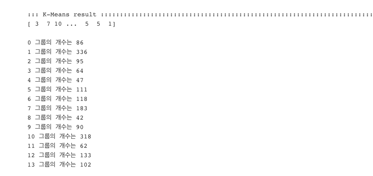scikit learn 내의 라이브러리인 KMEANS를 사용하여 비슷한 주제를 가진 기사들을 그룹화한다. 여기서 k 값은 √( 로 정했다.
