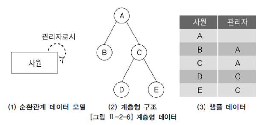계층형 데이터란 동일 테이블에 계층적으로 상위와 하위 데이터가 포함된 데이터를 말한다. 엔터티를 순환관계 데이터 모델로 설계할 경우에 계층형 데이터가 발생하는데, 순환관계 데이터 모델의 예로는 조직, 사원, 메뉴 등이 있다.