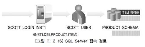 예를 들어 아래 그림을 보면 SCOTT 이라는 LOGIN 이름으로 인스턴스 INST1 에 접속하여 미리 매핑되어 있는 SCOTT 이라는 유저를 통해 PRODUCT 라는 스키마에 속해있는 ITEM 이라는 테이블의 데이터에 엑세스 하고있다.