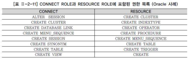 Oracle에서는 기본적으로 몇 가지 ROLE을 제공한다. 그 중 가장 많이 사용하는 ROLE은 CONNECT와 RESOURCE 이다. CONNECT 는 CREATE SESSION과 같은 로그인 권한이 포함되어 있고, RESOURCE는 CREATE TABLE과 같은 오브젝트의 생성 권한이 포함되어있다. 일반적으로 유저를 생성할 때 CONNECT와 RESOURCE ROLE을 사용하여 기본 권한을 부여한다.