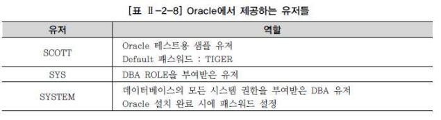 대부분의 데이터베이스는 데이터 보호와 보안을 위해서 유저와 권한을 관리하고 있는데, 예를 들어 Oracle에서 제공하는 유저들은 다음과 같다.