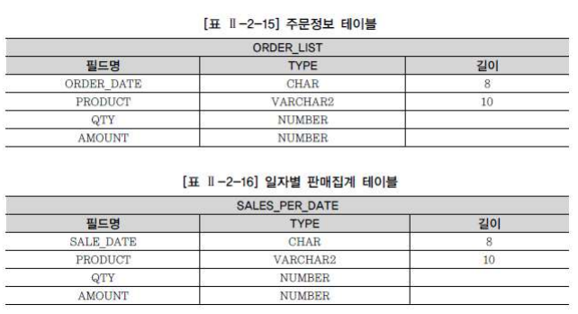 예제) Trigger를 사용하여 주문한 건이 입력될 때 마다, 일자별 상품별로 판매 수량과 판매 금액을 집계하여 집계 자료를 보관하도록 한다. 먼저 관련 테이블을 생성한다.