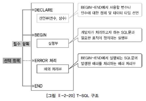 - ERROR 처리 : BEGIN ~ END 절에서 실행되는 SQL 문이 실행될 때 에러가 발생하면 그 에러를 어떻게 처리할 것인지를 정의하는 예외 처리부
