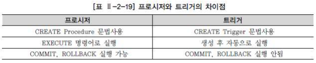프로시저는 BEGIN ~ END 절 내에 COMMIT, ROLLBACK 과 같은 트랜잭션 종료 명령어를 사용할 수 있지만, 데이터베이스 트리거는 BEGIN ~ END 절 내에 사용할 수 없다.