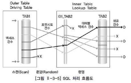 - TAB1 에 대한 액세스는 스캔 방식이고, 조인 시도 및 101_TAB2 인덱스를 통한 TAB2 액세스는 랜덤 방식이다. 대량의 데이터를 랜덤 방식으로 액세스하게 되면 많은 I/O가 발생하여 성능상 좋지 않다.