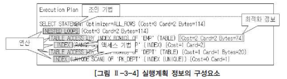 - 액세스 기법 : 하나의 테이블에 액세스할 때 사용할 수 있는 방법이다. 여기에는 인덱스를 이용하여 테이블에 액세스하는 인덱스 스캔과 테이블 전체를 모두 읽으면서 조건을 만족하는 행을 찾는 전체 테이블 스캔 등이 있다. 위 그림에서는 인덱스 스캔을 사용하고 있다.