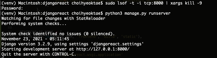 장고 실행시 이런 에러 메시지가 뜬다면 port 8000과 관련된 프로세스를 종료하고 다시 실행한다.
