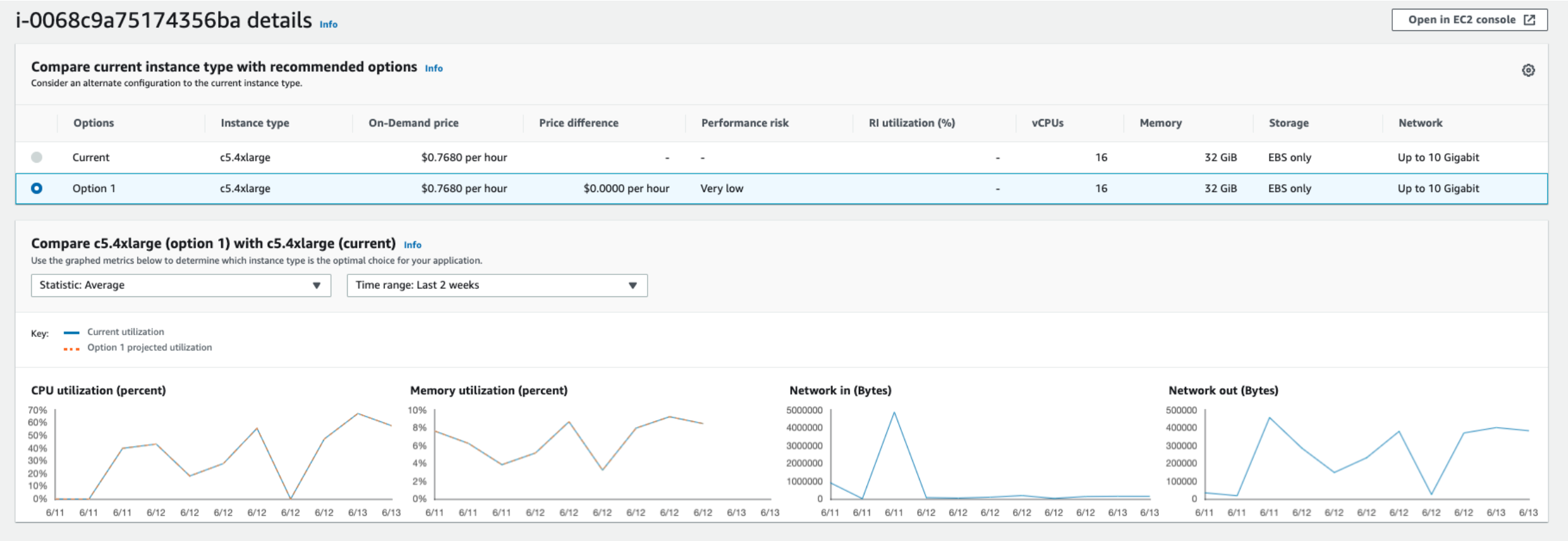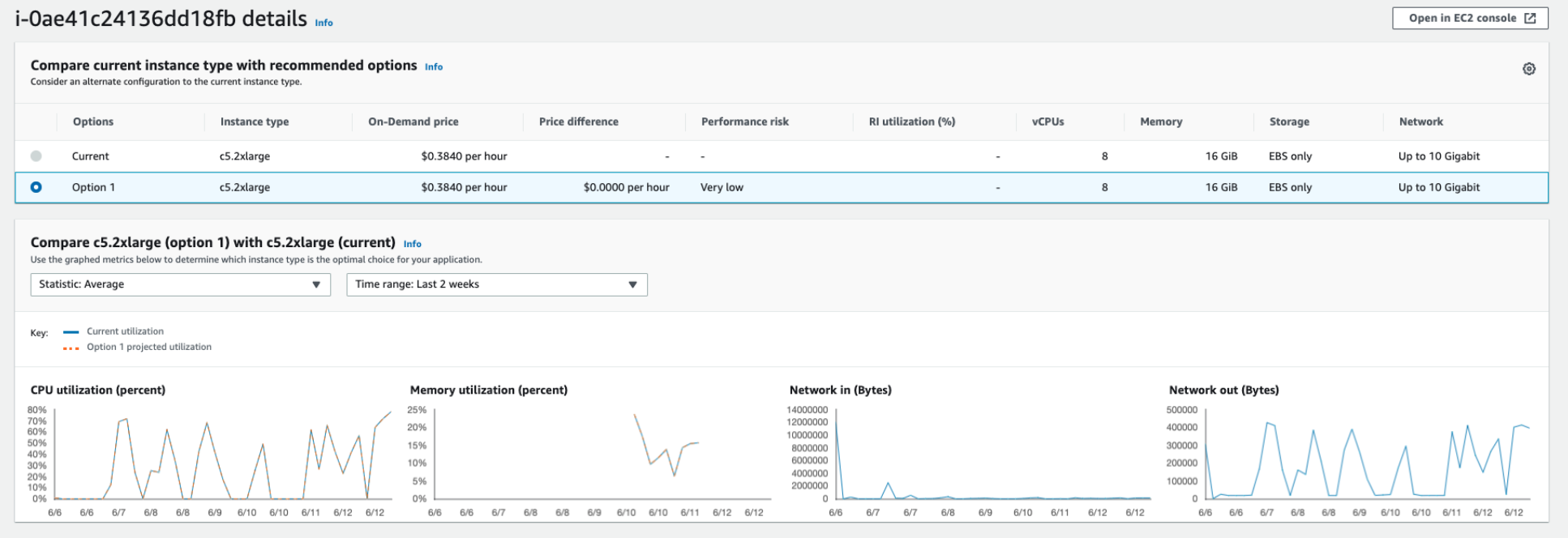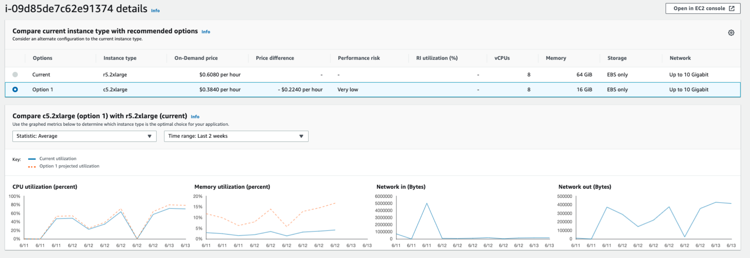 이 인스턴스는 현재 Over provisioned 된 상태로, Compute Optimizer는 인스턴스를 c5.2xlarge로 변경할 것을 권장했다.