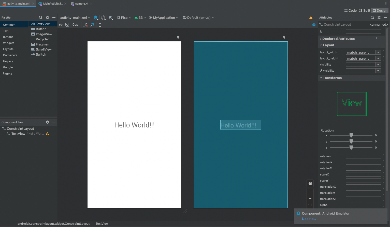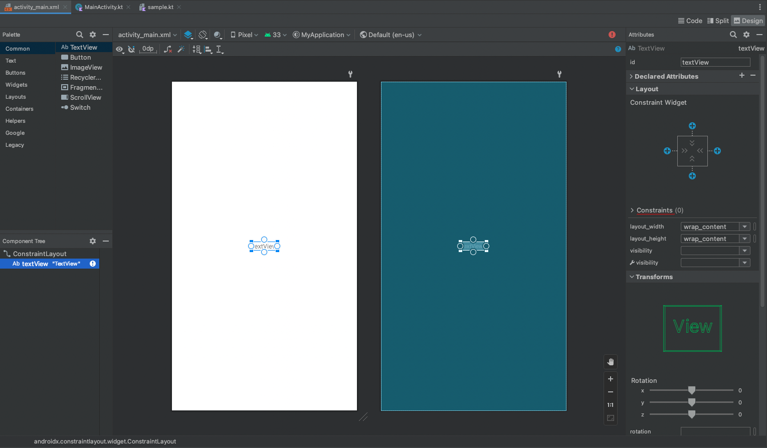 끌어다 놓기만 했는데도 코드에 TextView 가 자동으로 생성된 것을 확인할 수 있다.
