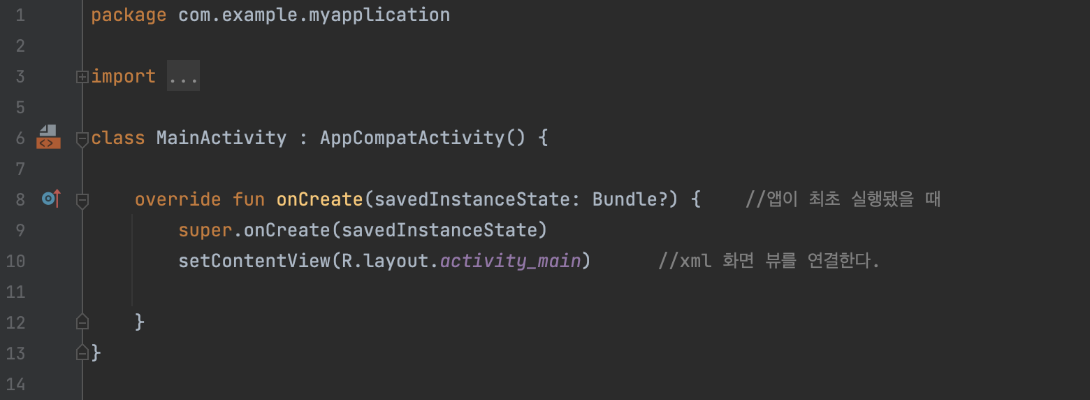 앱이 최초로 실행됐을 때 onCreate 함수를 실행하고, setContentView 함수로 xml 화면 뷰를 연결하는 방식이다.