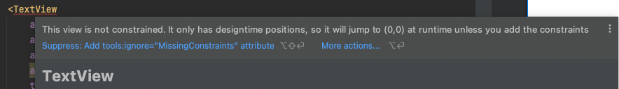 하지만 이 뷰가 not constrained 되어있다고 에러가 나는데, 그것은 이 TextView에 대한 제약을 아직 걸지 않아서 생기는 오류다.